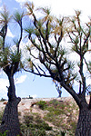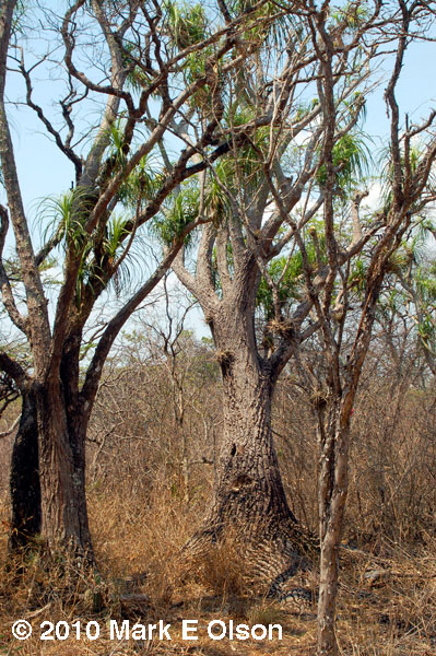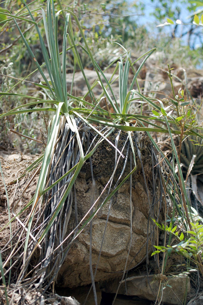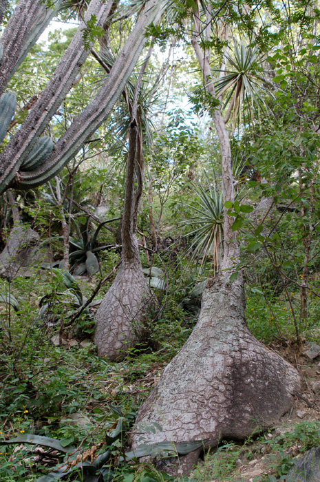 Oaxacan populations of Beaucarnea recurvata tend to have especially thick trunks. The photos here are from a very dense tropical dry forest with very fat but short B. recurvata, the columnar cactus Neobuxbaumia scoparia and an understory of the terrestrial bromeliad Hechtia. |