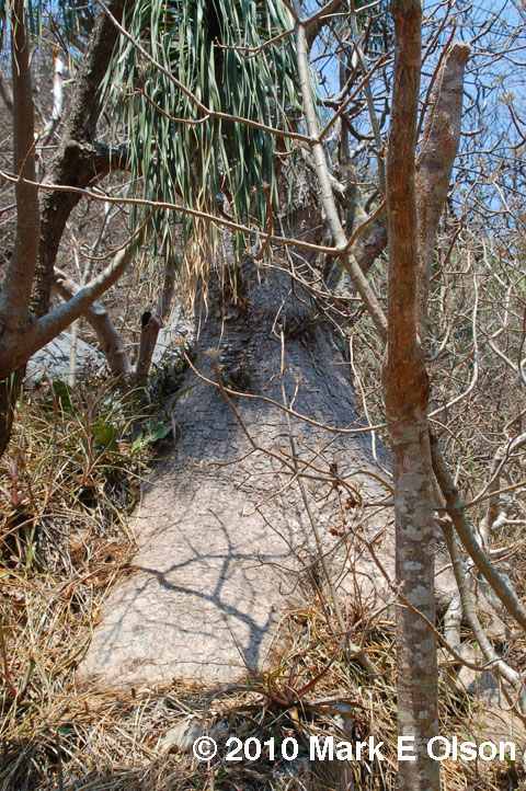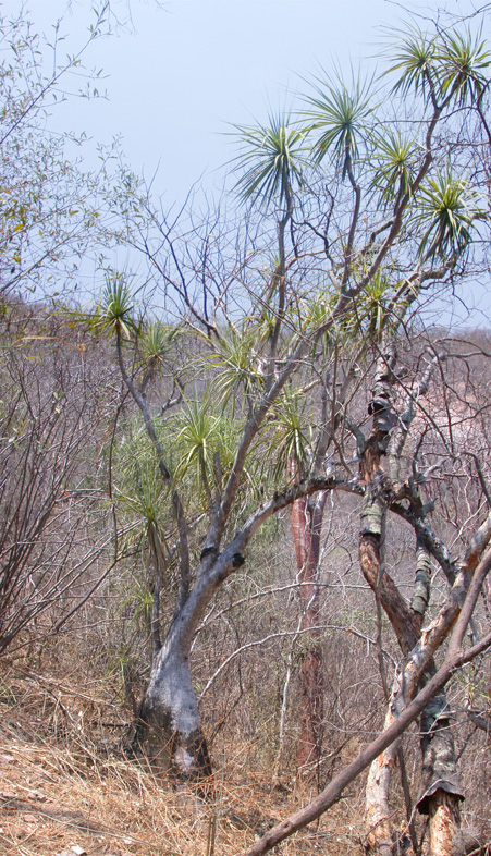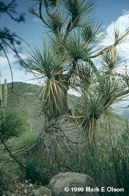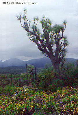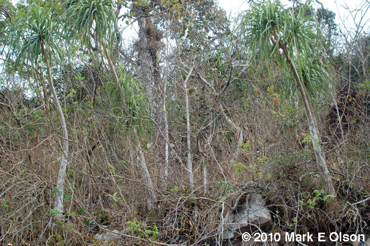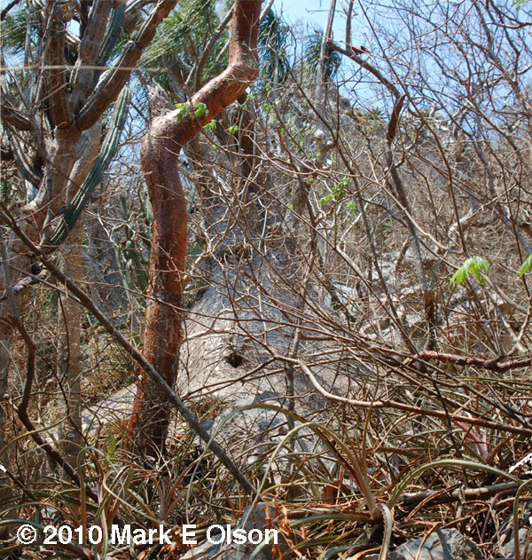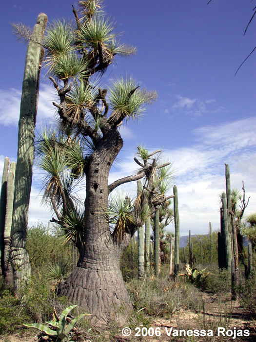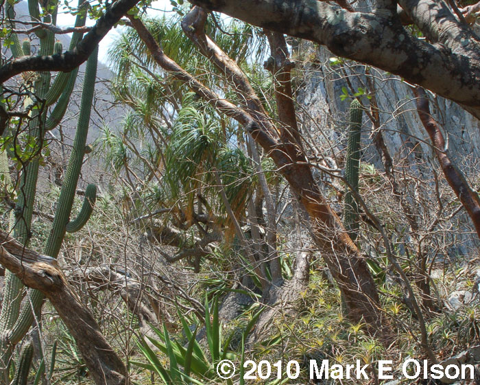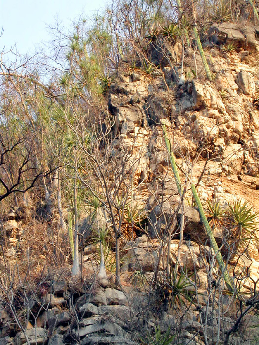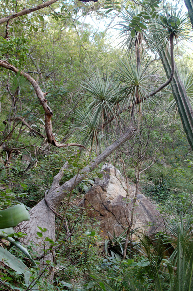 A massive individual of Beaucarnea recurvata growing with Bursera ovalifolia and Neobuxbaumia scoparia with Hechtia in the foreground. This image was taken toward the end of the dry season. You can see the Hechtia leaves curled from the long drought and other plants leafing out in anticipation of the rains. |