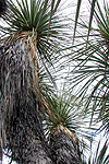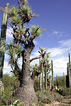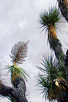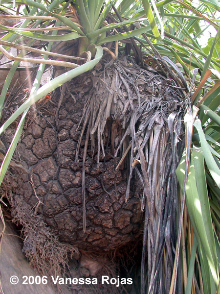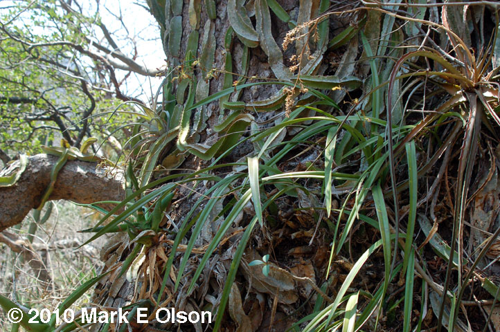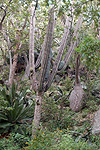 The trunk of Beaucarnea recurvata is often swathed in epiphytes. This large individual had its trunk carpeted with the cactus Selenicereus testudo, along with agaves, orchids, bromeliads, and even a seedling of Plumeria. |