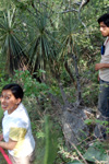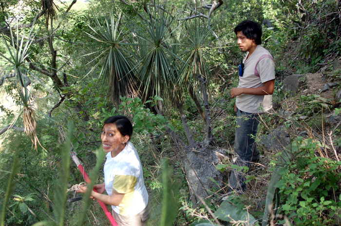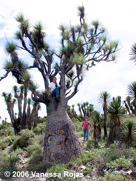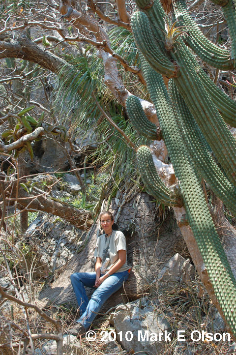 Beaucarnea recurvata in the wild in Oaxaca, with Julieta for scale. You can get an idea of the size of the massive conical trunk of these plants, and of the relatively short branches of these individuals. The cactus at right is Neobuxbaumia scoparia. |