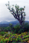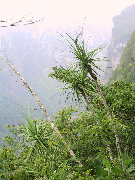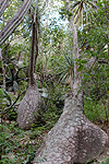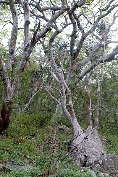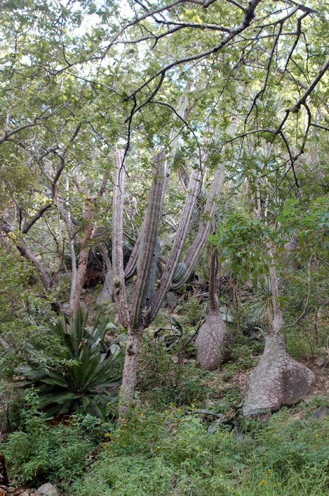 The forest in this area is so dense that it is hard to take photos that do the plants justice. Rather than a clear view, it is more common to see the giant Beaucarneas as apparitions through tangles of branches. The individuals in this population are often 10 meters in circumference and about the same height! This image shows one large Beaucarnea at center and a smaller one at right. |