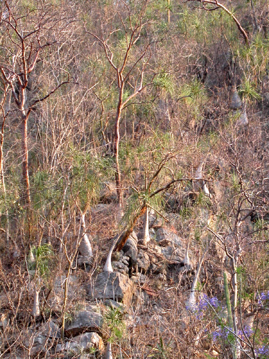 grows on steep hillsides, in this case with massive columnar cacti and