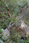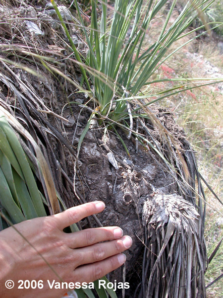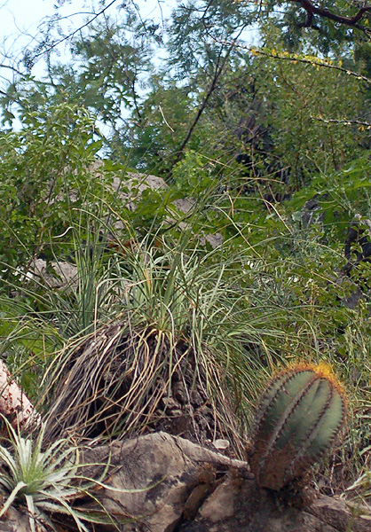 beneath a dense thatch of leaves. It often grows with cacti, as at