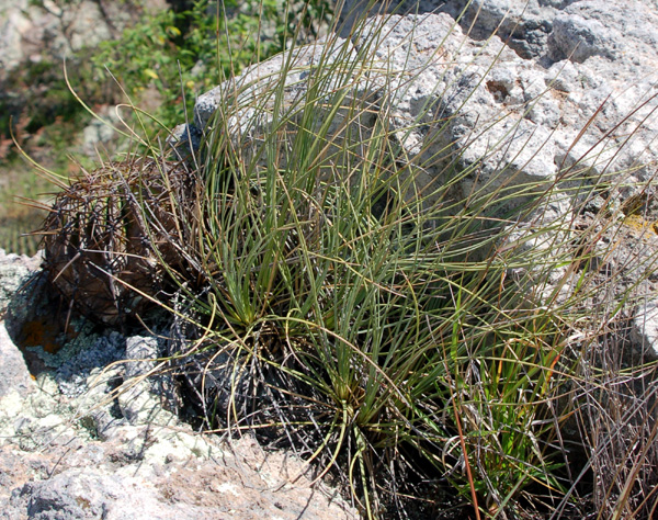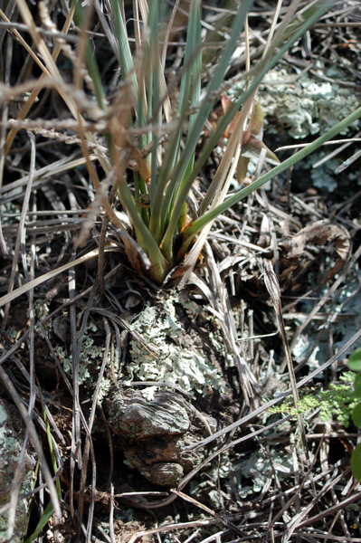 globular stem with rosettes of slender, stiff bluish leaves scattered