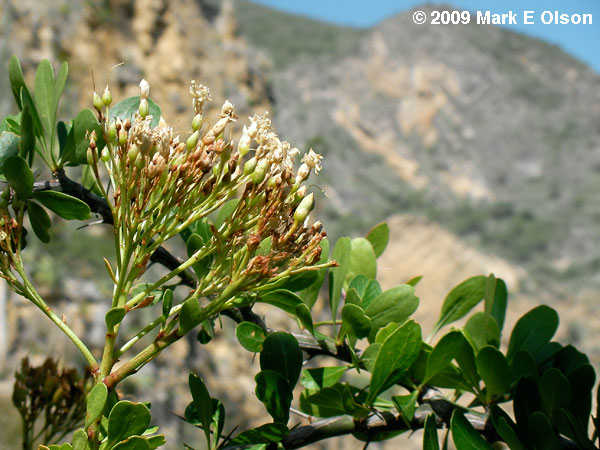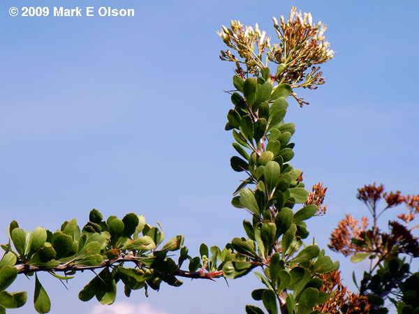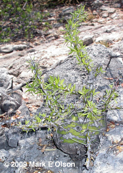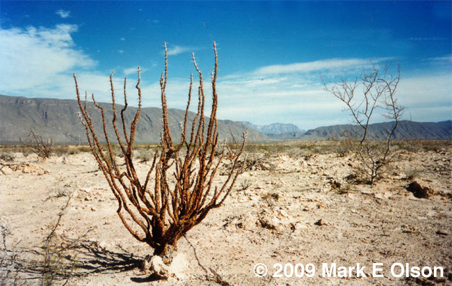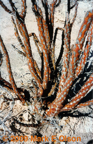 upward-arching stems, this small shrubby species cuts a strange figure on the Coahuila gypsum flats that are its