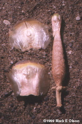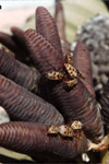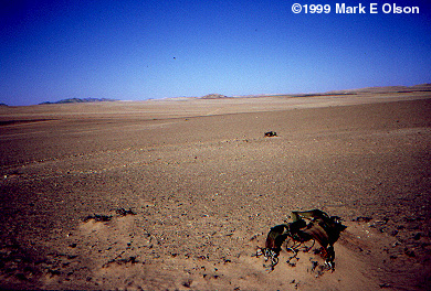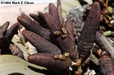 The plant Welwitschia mirabilis gets my vote for the weirdest terrestrial organism. Science fiction has never come up with any Martian to rival this plant. It has a low trunk and two leaves that sprawl on the Namib gravel for the entire life of the plant, which can span many hundreds of years. If this weren't enough, Welwitschia is a gymnosperm related to Mormon Tea (Ephedra) and produces seeds in cones, not from flowers. An individual Welwitschia plant produces either male or female cones, but never both.